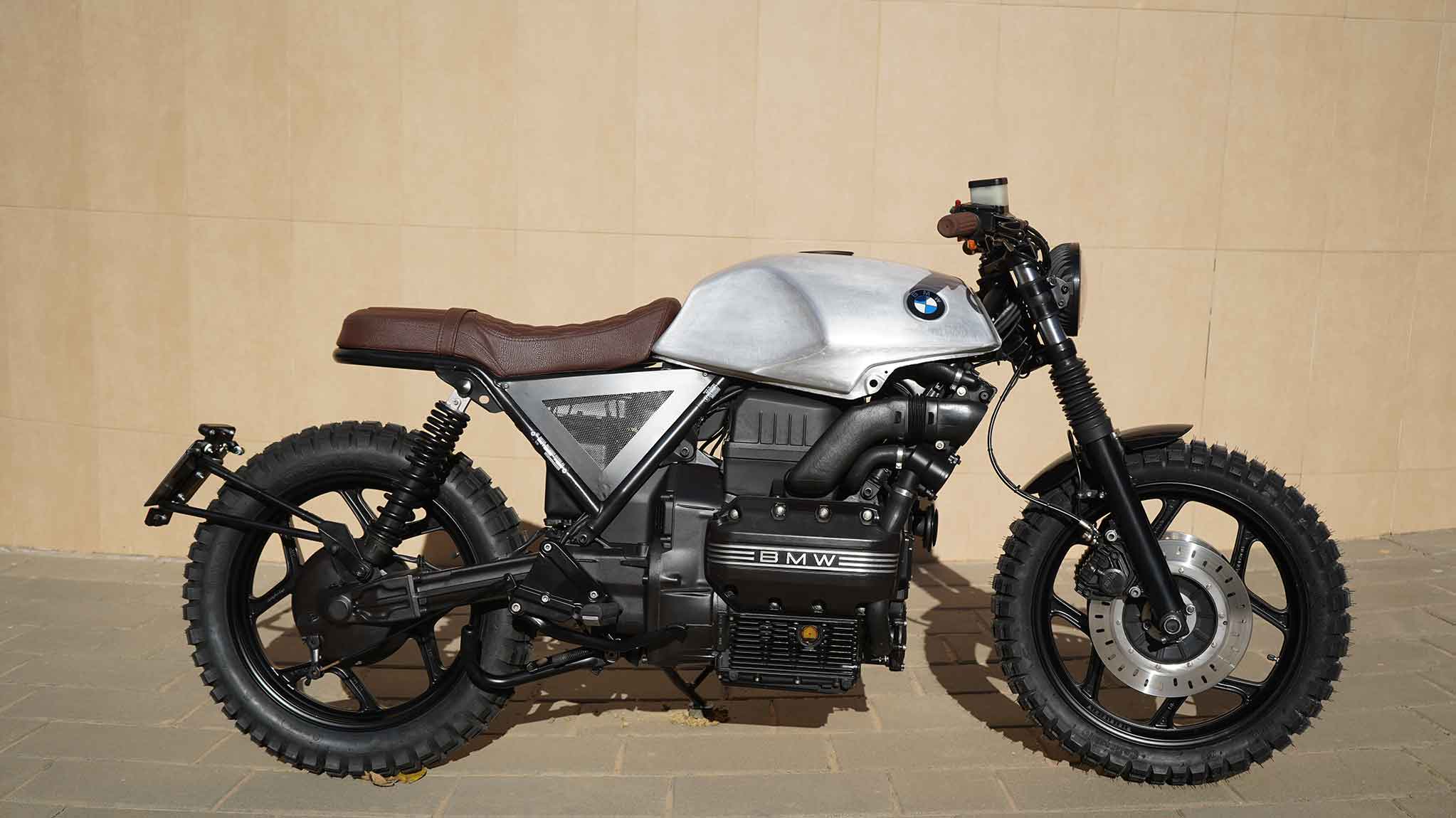 This BMW K75 scrambler is characterized like other similar units by Continental TKC 80 tires, tracker handlebar, seat and subframe modified to give it that Street tracker or scrambler style.