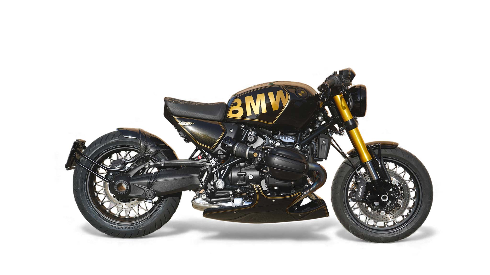 The aesthetics of this BMW R12 NINE T JPS are dominated by an elegant black with gold pearlescent accents, a classic combination reminiscent of the legendary “John Player Special” liveries. Gold lines and graphics have been applied to this base, lending a luxurious yet sporty finish. The result is a deep, rich paint job with striking reflections, perfectly harmonized with the other metallic elements and custom details.