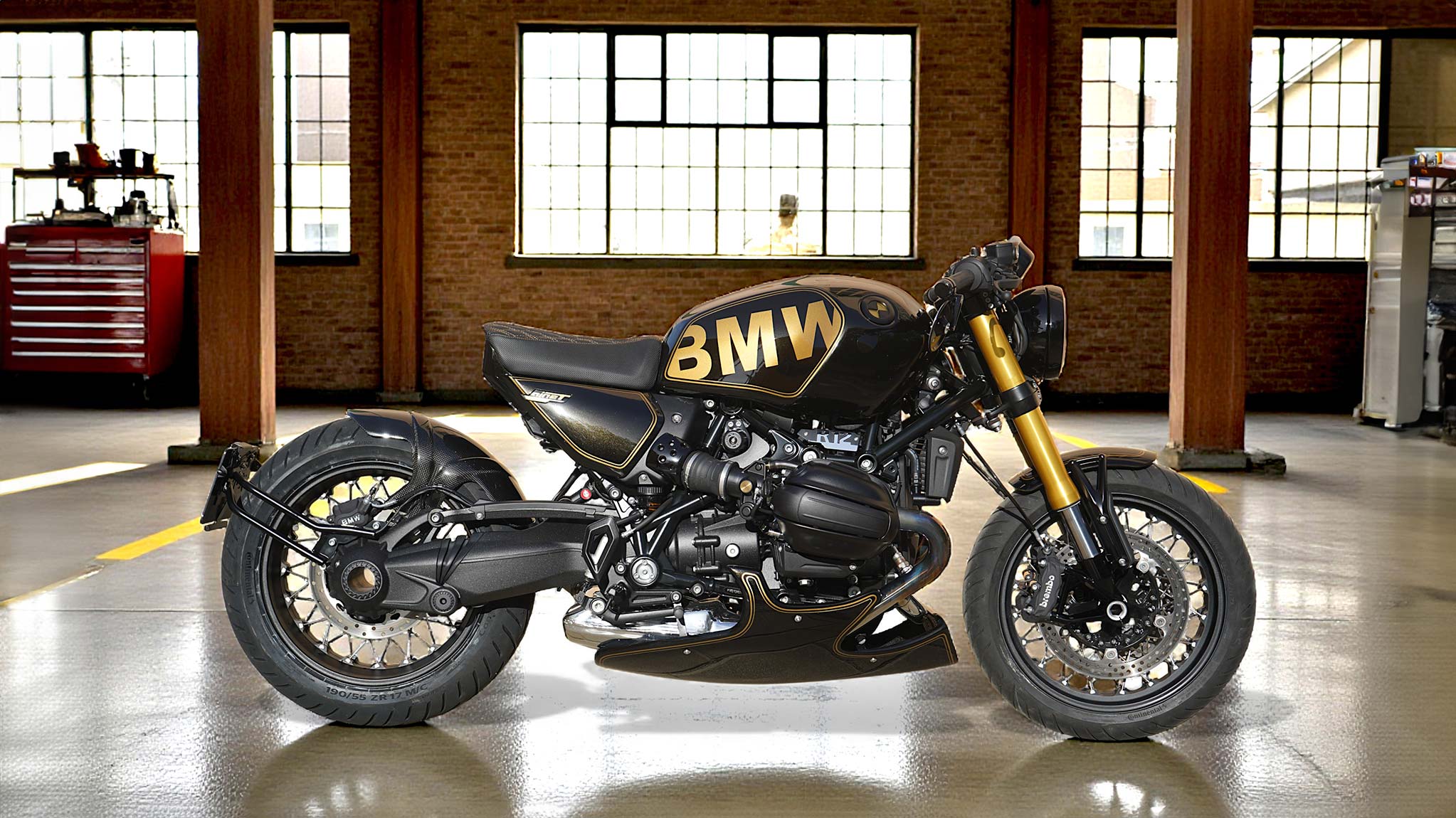 The aesthetics of this BMW R12 NINE T JPS are dominated by an elegant black with gold pearlescent accents, a classic combination reminiscent of the legendary “John Player Special” liveries. Gold lines and graphics have been applied to this base, lending a luxurious yet sporty finish. The result is a deep, rich paint job with striking reflections, perfectly harmonized with the other metallic elements and custom details.