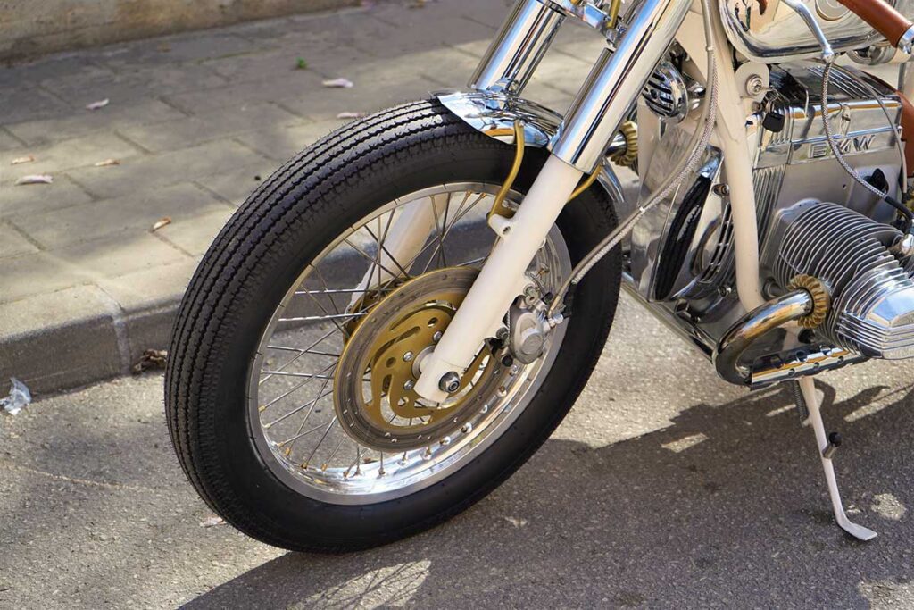 En esta BMW bobber scrambler también destacamos el asiento colgante tapizado en marrón con rombos, amortiguadores con botella de aire y los guardabarros recortados pegados a las ruedas de estilo bobber y finalmente unos neumáticos continental TKC 80.