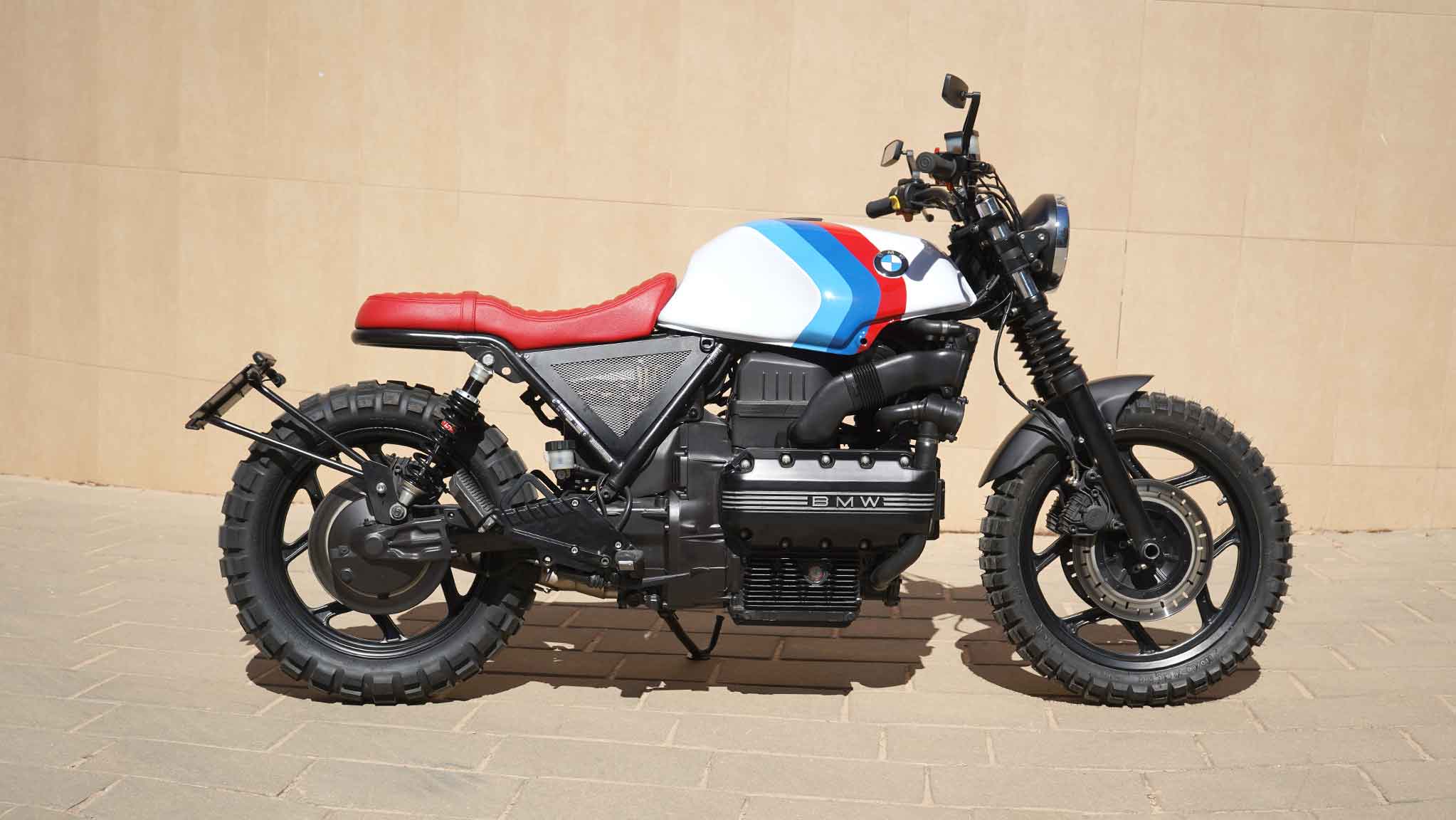 Fran Manen (propietario de Lord Drake Kustoms) recogió esta BMW K100 totalmente original en Madrid. Su propietario quería que fuese de una moto de estilo scrambler pero lo más baja posible, con neumáticos de campo y sobre todo el asiento debía de ser rojo y el depósito de gasolina con los colores de BMW M.