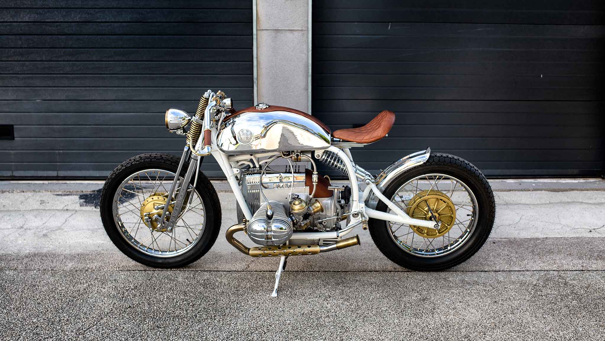 Cuero marrón, pintura en polvo blanco y cromados combinados con baños de latón envejecido han dado color a esta impresionante BMW con horquilla springer.