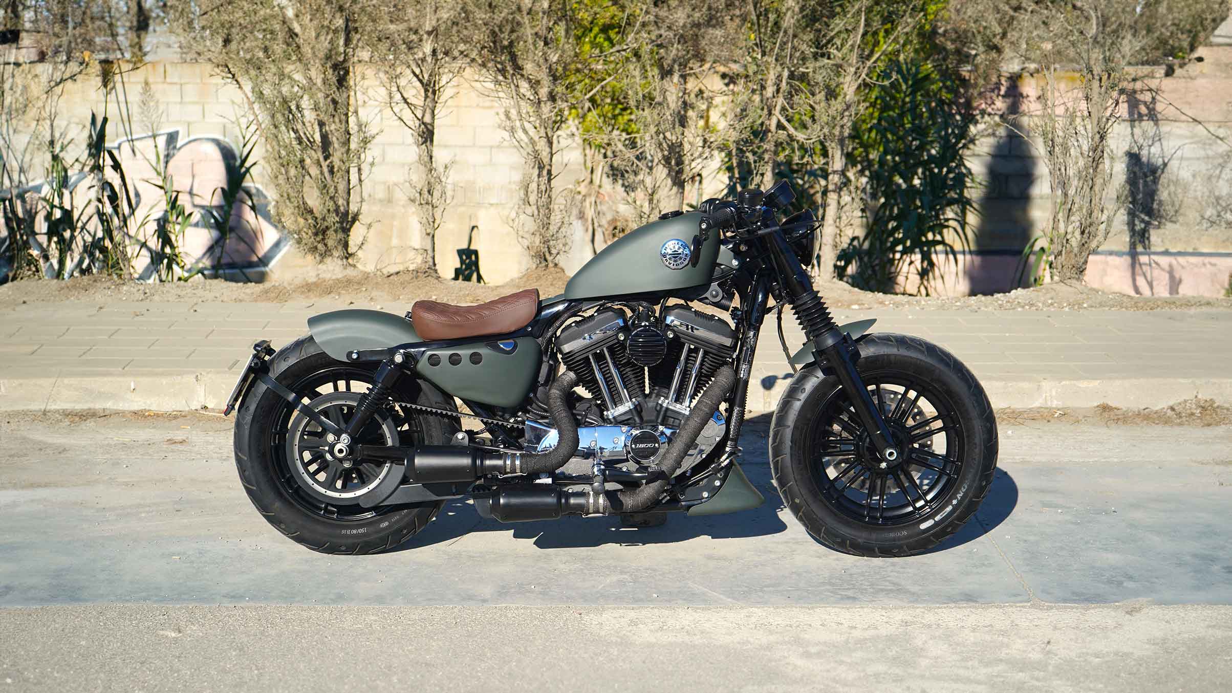 Para el acabado Fran Manen, decidió que la carrocería debía ser pintada en verde militar mate; la cual ha sido acompaña de una combinación de negro brillo y negro mate en el resto de partes y componentes de la moto y con un asiento en piel marrón con rombos. Elementos como el impresionante tubo de escape con colas tipo granadas, las tapas del motor en cromado o los emblemas clásicos de la Harley Davidson en el depósito de gasolina han dado un look brutal a esta Sportster Bobber.