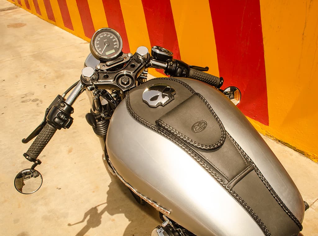 A pesar de ser una Sportster cafe racer, su estilo cambió un poco cuando decidimos instalarle un asiento de muelles que fue fabricado y tapizado de forma artesanal; ya que en Lord Drake Kustoms contamos con servicio de fabricación y tapizado de asientos de motos a medida.