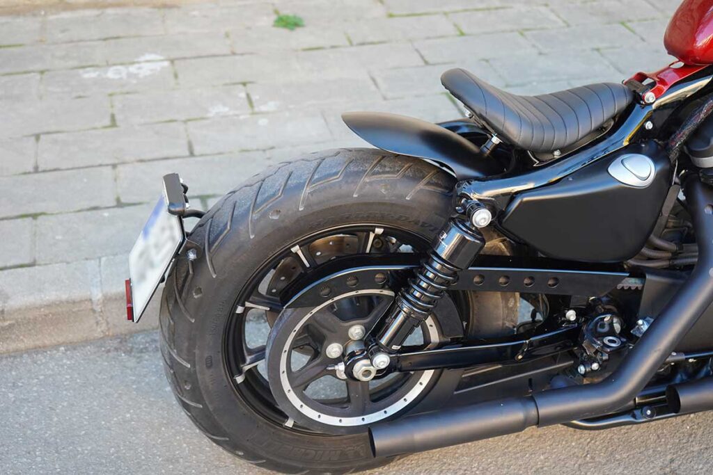 Hemos recortado el subchasis para convertir esta Harley en monoplaza y le hemos fabricado un nuevo guardabarros trasero muy corto, que hemos acompañado con otro guardabarros delantero también recortado.