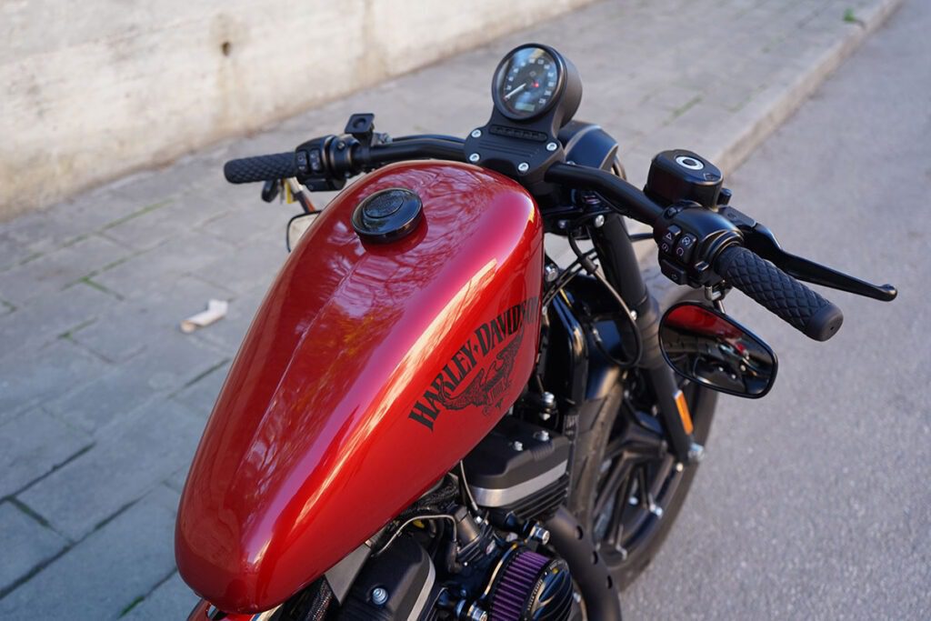 Diríamos que en esta ocasión más que una customización de Harley Davidson completa, ha sido un restyling, pues hemos mantenido muchas piezas originales de esta Iron 883 del 2019, como son las llantas o el depósito de gasolina y su bonita pintura en color rojo candy.