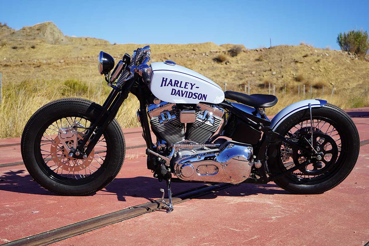 « Springer Bobber Blue » est le nom de cette Harley Davidson Softail Standard transformée par Lord Drake Kustoms dans son atelier Harley et custom à Malaga (Espagne).