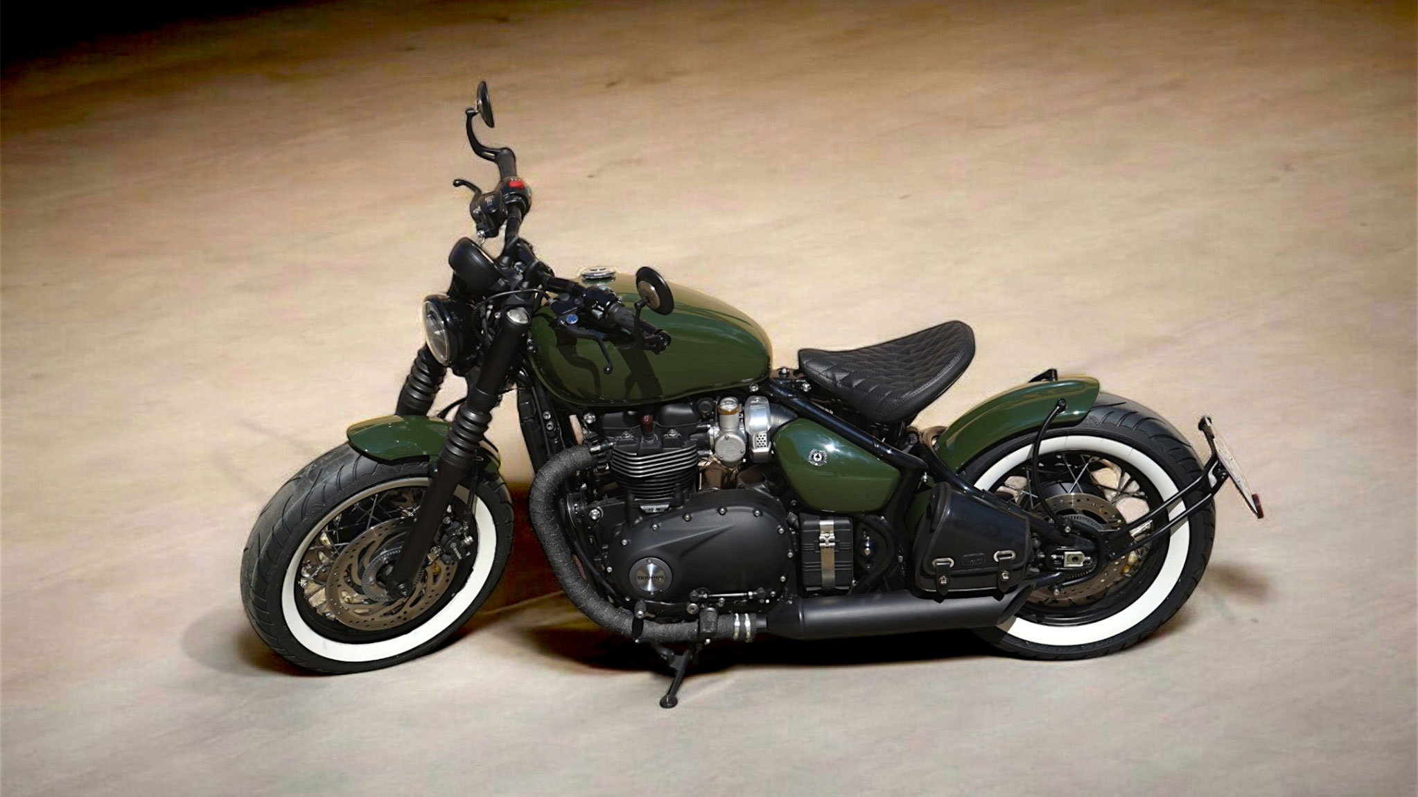 To give it an unmistakable retro touch, this Triumph Bobber was painted in a bright olive green color. Additionally, Avon whitewall tires were installed, the exhaust headers were wrapped with heat-resistant tape, and the seat was upholstered with an elegant diamond finish. These details enhance its classic style and give it an unparalleled presence.