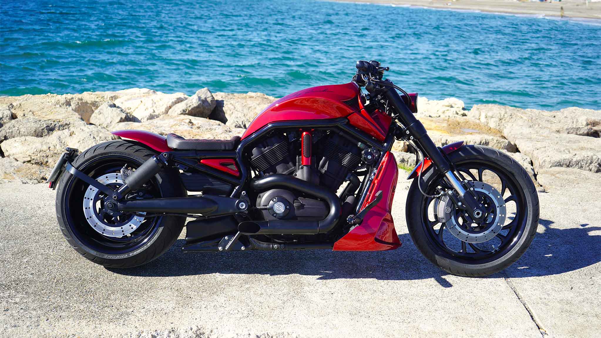 This Harley-Davidson Vrod MUSCLE 330 has been finished with a nice candy red paint and gloss black stripes, which has given it a spectacular look.